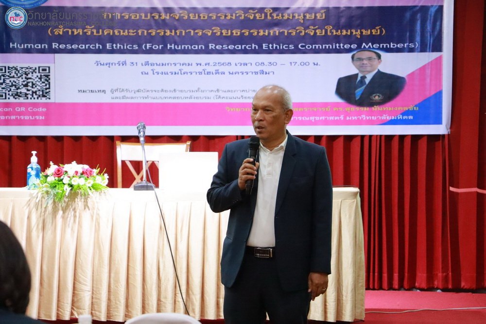 รายละเอียดกิจกรรม : เมื่อวันศุกร์ที่ 31 มกราคม พ.ศ. 2568 เวลา 08.30-17.00 น. สำนักงานวิจัยและพัฒนา จัดโครงการอบรมเชิงปฏิบัติการ การอบรมจริยธรรมวิจัยในมนุษย์ (สำหรับคณะกรรมการจริยธรรมการวิจัยในมนุษย์) ณ โรงแรมโคราชโฮเต็ล นครราชสีมา