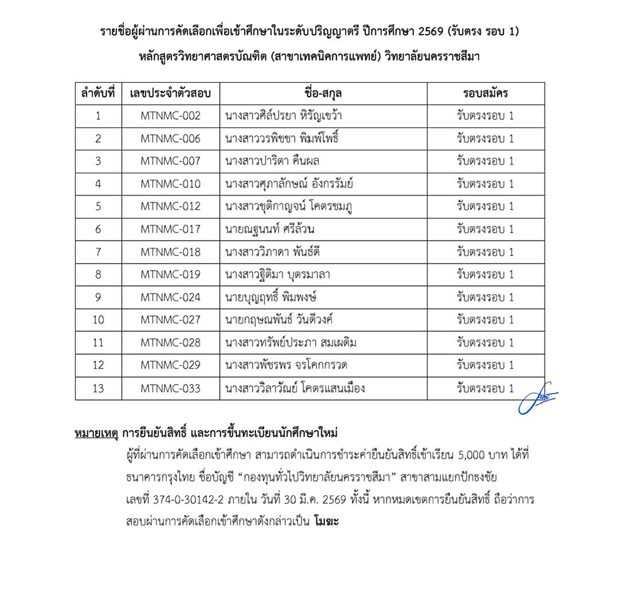 หัวข้อ : ประกาศรายชื่อผู้ผ่านการคัดเลือกเพื่อเข้าศึกษาในระดับปริญญาตรี ปีการศึกษา 2569 (รับตรงรอบ 1) หลักสูตรวิทยาศาสตรบัณฑิต (สาขาเทคนิคการแพทย์) วิทยาลัยนครราชสีมา